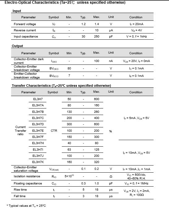 EL3H7(B)(TA)-G,SOP-4封装,1.27MM PIN脚距,广泛应用于伺服驱动,PLC,运控控制卡,采集卡等产品上。由于其小体积,性价比,很多客户选用。可以直接替代TLP291,LTV-217,TCMT1100,ACPL-217.