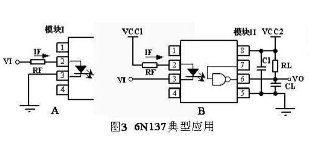 隔离器6N137典型应用如图所示,假设输入端属于模块I,输出端属于模块II。输入端有A、B两种接法,分别得到反相或同相逻辑传输,其中RF为限流电阻。发光二极管正向电流0-250μA,光敏管不导通;发光二极管正向压降1.2-1.7V(典型1.4V),正向电流6.3-15mA,光敏管导通。若以B方法连接,TTL电平输入,Vcc为5V时,RF可选500Ω左右。如果不加限流电阻或阻值很小,6N137仍能工作,但发光二极管导通电流很大对Vcc1有较大冲击,尤其是数字波形较陡时,上升、下降沿的频谱很宽,会造成相当大的尖峰脉冲噪声,而通常印刷电路板的分布电感会使地线吸收不了这种噪声,其峰-峰值可达100mV以上,足以使模拟电路产生自激。所以在可能的情况下,RF应尽量取大。